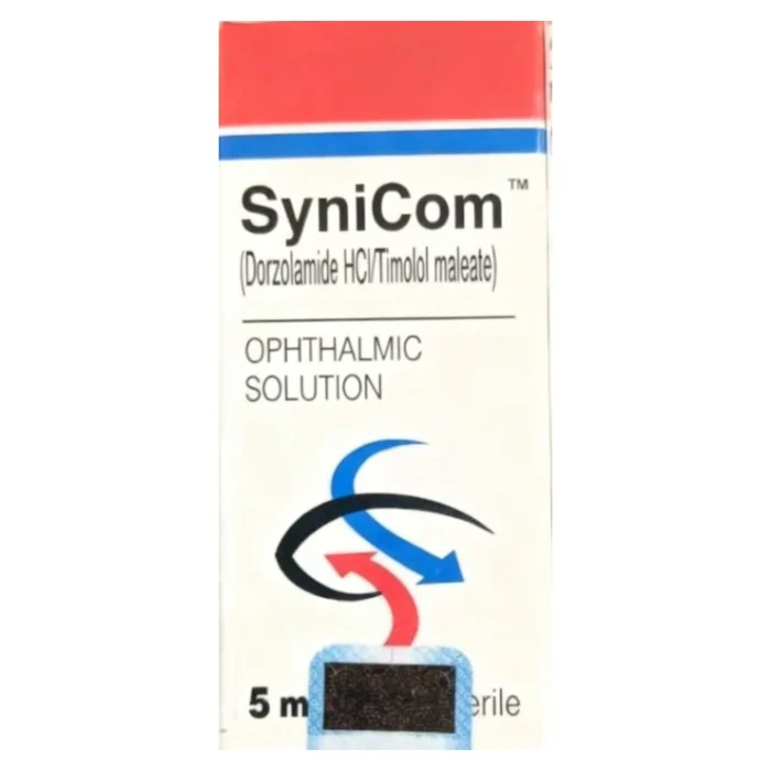 Synicom Eye Drops (5ml) are a prescription medication containing Dorzolamide HCl and Timolol Maleate, designed to treat glaucoma and ocular hypertension by reducing high eye pressure. The typical dosage is one drop in the affected eye(s) twice daily. Side effects may include burning, stinging, and blurred vision