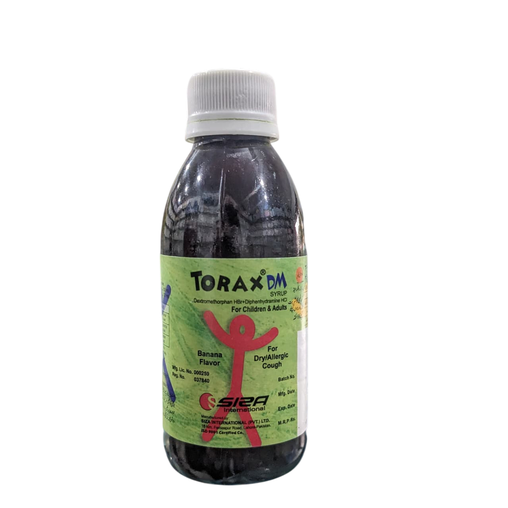 Torex DM Syrup (60ml) is a combination medication primarily used to treat dry coughs, particularly those associated with allergies, common colds, and throat irritation. It acts as a cough suppressant by reducing activity in the brain’s cough center, while also relieving symptoms like sneezing, runny nose, and watery eyes.