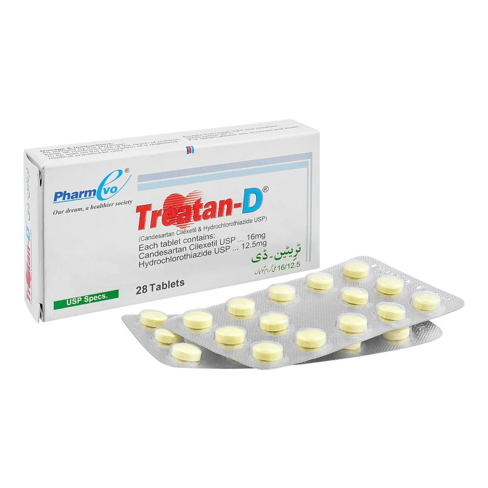 Treatan-D 16/12.5mg Tablet is a combination antihypertensive medicine containing Candesartan (16mg) and Hydrochlorothiazide (12.5mg). It is used to manage high blood pressure and prevent related cardiovascular conditions.
